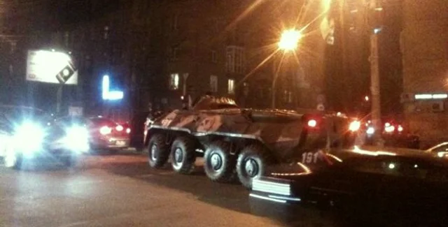 Сообщается, что толпа активистов остановила бронемашину, после чего БТР развернулся и поехал в сторону Выдубичей.