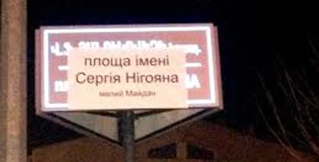 Вывеска с именем президента Украины была сменена на новую, согласно которой площадь теперь будет носить имя первого погибшего на Майдане активиста - Сергей Нигояна, пишет РБК-Украина со ссылкой на Araratnews.