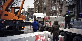 Дорогу перегораживают бетонными плитами и мешками с песком.