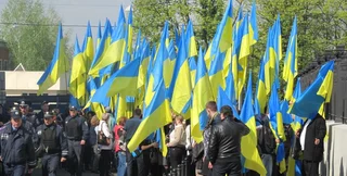 Порядка 150 человек с флагами Украины пришли утром 23 апреля под здание Харьковского городского совета на митинг в поддержку территориальной целостности Украины.