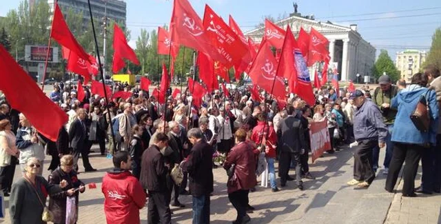 На площади Ленина перед коммунистами выступили лидеры партии КПУ, а также представители самопровозглашенной Донецкой народной республики.