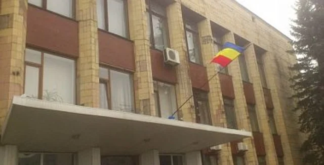Над входом в мэрию висит желто-сине-красный флаг Донской области