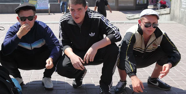 В речи большое количество слов-паразитов, в числе которых: "короче", "типа" и "слышь" ("сышишь"), и мата. Распространена привычка сидеть на корточках, Возможно отсутствие передних резцовых зубов ввиду пренебрежения гигиеной полости рта, частого употребления нечищеных подсолнечных семян, а также в результате драк.