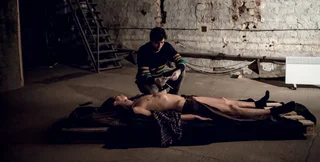 Время от времени экран гаснет. И тогда внимание зрителей сосредотачивается на молодом человеке в серой шапочке (в зале прохладно), который комментирует происходящее. Из комментариев ясно, что умирающий мужик — сепаратист. Актер рассказывает о том, как военные медики хотели кого-то спасти, но не спасли. Или как не хотели, но спасли. Текст звучит подчеркнуто буднично, события излагаются безоценочно. И все же чувствуется, что актер сопереживает экранным героям, в том числе и раненому сепаратисту. Под экраном лежит тело — солдат в камуфляже. В какой-то момент парень в шапочке быстрыми профессиональными движениями разрезает камуфляж — так снимают одежду с раненого санитары. И совершенно голый мужчина продолжает неподвижно лежать перед зрителями. Все это действо называется пьесой "Товар".