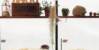 Всего в кафе в стеклянных ящиках живут от 20 до 30 ежей разных видов. При желании посетители могут с ними поиграть.