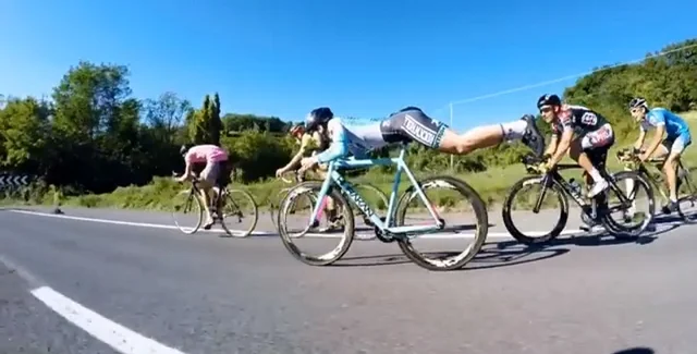 Итальянский велосипедист Михаэль Гуэрра, уменьшив площадь сопротивления воздушному потоку, с аэродинамическим преимуществом обошел вовсю крутящих педали коллег.