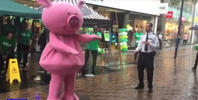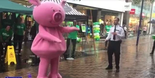 В Лондоне сотрудник полиции устроил эпическую танцевальную битву с человеком в костюме огромной свиньи. Видео необычного соревнования было заснято случайными прохожими и размещено в Facebook.