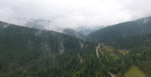 С высоты птичьего полета открываются живописные зеленые склоны вершины, несмотря на то, что половина сентября уже позади. На кадрах также видно, как могучие деревья окутывает густой туман.
