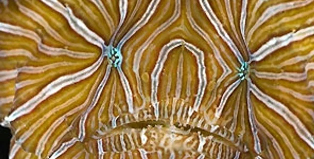 Психоделическая желтая рыба покрыта бело-синими полосками, расходящимися в разные стороны от ее голубых глаз. У нее широкая и плоская голова, а глаза смотрят прямо, как у человека.