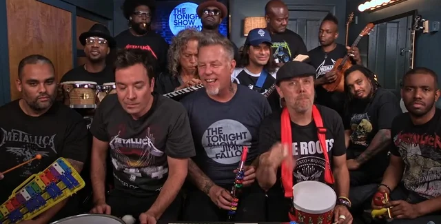 Культовая американская рок-группа Metallica в эфире вечернего шоу Джимми Феллона сыграла на игрушечных инструментах популярную песню Enter Sandman.