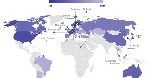 Первое место в рейтинге сохранила Южная Корея, второе заняла Швеция, третье – Германия. Южная Корея возглавляет рейтинг благодаря самой большой удельной величине расходов на научные исследования и разработки, патентной активности, производству с добавленной стоимостью и уровню высшего образования.