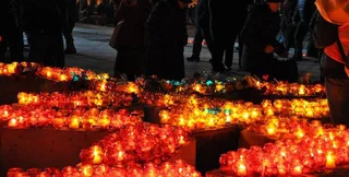 На майдане Незалежности выложили трезубец из бетонных блоков, на который ставили лампадки со свечами. Также из лампадок выложили девиз "Героям слава!". Весь день и вечером люди продолжают нести цветы.