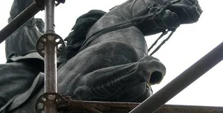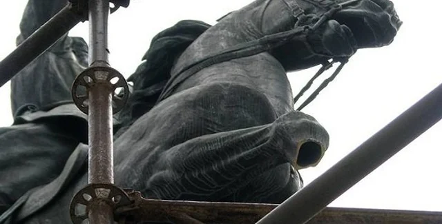 Как сообщают очевидцы в соцсетях, у монумента отпилили бронзовую ногу лошади.