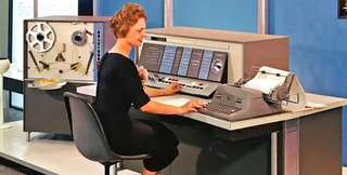 Выходим на третьем этаже и через коридорный лабиринт попадаем в огромный колонный зал. Здесь стоят громоздкие аппараты для обработки телеграмм и за компьютерами трудятся специалисты в форменных халатах.