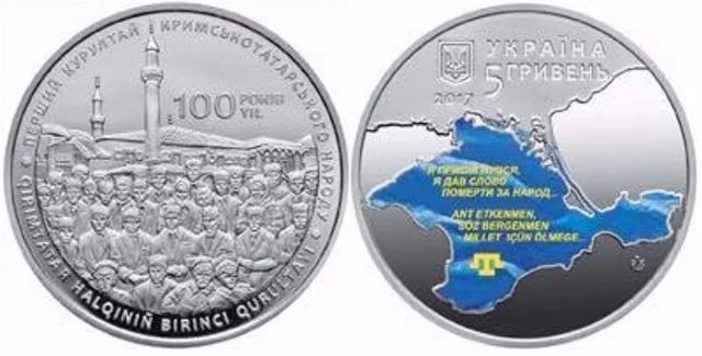 Национальный банк Украины и Институт геостратегии имени Исмаила Гаспринского выпустили памятную монету номиналом в 5 гривен, посвященную 100-летию первого Курултая крымскотатарского народа.