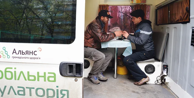 Мы стоим во дворе на Оболони возле микроавтобуса с надписью "Альянс. Мобильная амбулатория". Леша и его девушка Даша пришли сюда, чтобы провериться на ВИЧ и гепатит С. Людям, употребляющим наркотики инъекционно, нужно тестироваться раз в полгода, но Леша и Даша не делали этого уже два года.