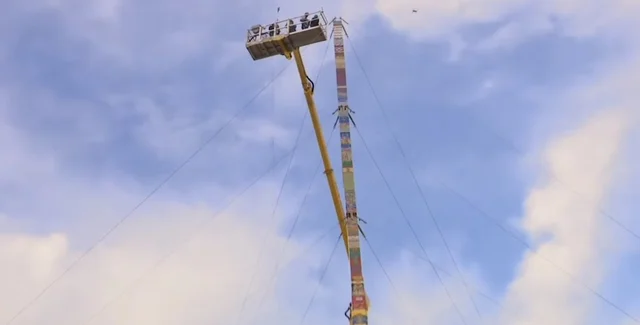 Башня достигает в высоту примерно 36 метров, что равняется высоте 12-этажного дома. Для конструкции использовали 500 тыс. деталей. К строительству башни привлекли тысячи жителей города.