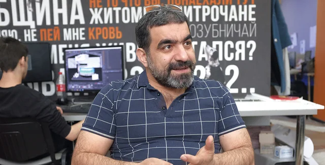 С Мехтиевым мы встретились в его офисе в одном из спальных районов Киева. В большом открытом пространстве на первом этаже работают десятки людей, слышны переговоры на английском. На одной из стен — десяток часов, каждые из них показывают время в разных городах мира, от Гонконга и Мумбаи до Филадельфии. Их названия написаны прямо на стекле маркером, и когда локации бизнеса меняются, то на часах пишут новый город, неизменным остается только время Киева. Эльшан Мехтиев — владелец бюро ArchitectureNEO, которое специализируется на изготовлении и монтаже выставочных стендов из стекла, имеет международные патенты и работает по всему миру. В офисный шум вклиниваются птичьи голоса — над столом бизнесмена в большой клетке живет семья шоколадных амадинов, а в углу на подстилке обитает метис Марта. По человеческим меркам этой собаке уже 80 лет, у нее артроз и заплетающиеся задние лапы. Но Марта все равно подходит поздороваться с гостями.
