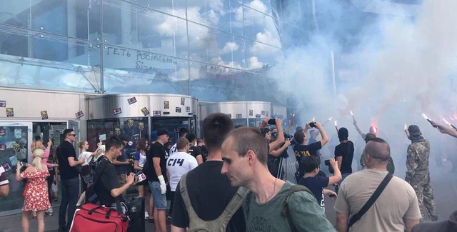 Сегодня, 6 июля, представители праворадикальных организаций "Сiч" (С14) и "Сокiл" вышли на акцию протеста к торговому центру Ocean Plaza в Киеве.