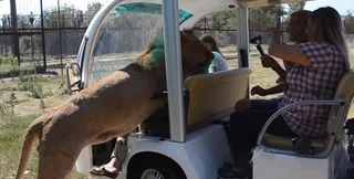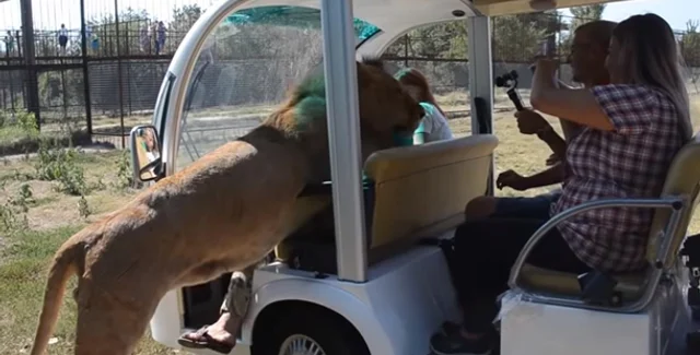 В Крыму в местном сафари-парке Тайган лев по кличке Филя залез на водительское сидение туристического авто.