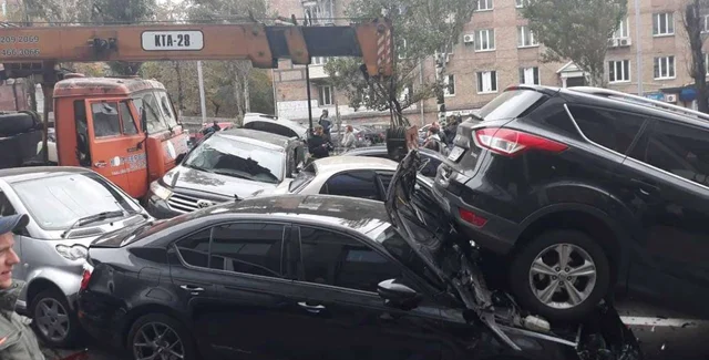 По предварительным данным у автокрана отказали тормоза и он понесся вниз по улице, сбивая по дороге остальные автомобли.