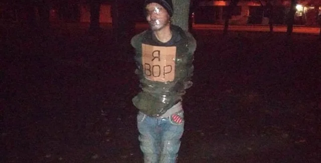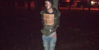 Жители Харькова устроили самосуд над подозреваемым в воровстве мужчиной, примотав его к столбу скотчем и приложив соответствующую табличку с надписью "Я - вор".
