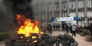 Протестующие принесли с собой автомобильные покрышки и подпалили их.