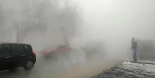 Улицу всю затянуло паром. Видимость на некоторых практически нулевая. Движение транспорта затруднено.