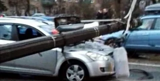 В Киеве на Куреневке во время движения на легковой автомобиль упал столб.