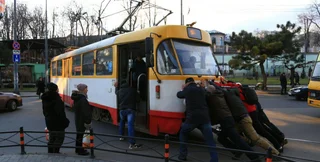 Нескольким пассажирам трамвая пришлось толкать его вручную, так как транспортное средство остановилось просто посередине дороги.