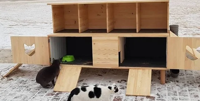 В Одессе на набережной пляжа "Лузановка" построили котопункт – двухэтажный деревянный домик, в котором животные могут укрыться от холода и покушать.