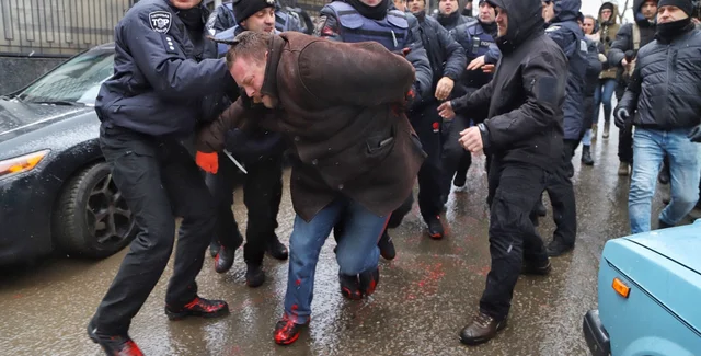 Как сообщает Думская, митингующие хотели испачкать забор и ворота диппредставительства красной краской, символизирующей кровь. В то же время правоохранители не позволили им это сделать. В итоге краска разлилась на асфальт и участников акции.