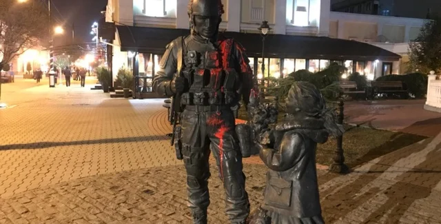 В центре оккупированного Симферополя мужчина облил краской памятник российским военным, которые в форме без опознавательных знаков участвовали в аннексии Крыма.