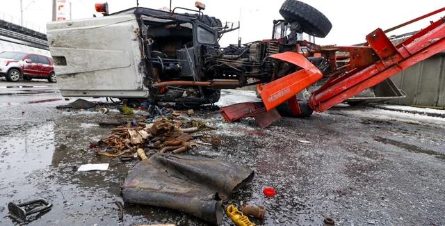 Авария случилась утром 13 февраля в Киеве на Столичном шоссе. Грузовик на полной скорости врезался в снегоуборочный трактор "Киевавтодора" и сбросил его с моста. Травмы получил водитель трактора. Про это сообщает Информатор.