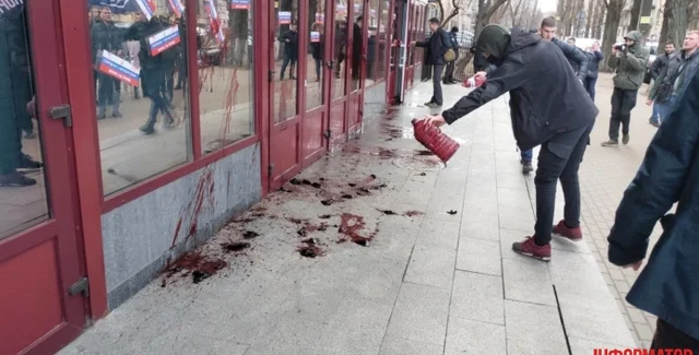 Активисты националистической организации "Традиция и порядок" залить кровью и обклеили стикерами вход в здание НАБУ.