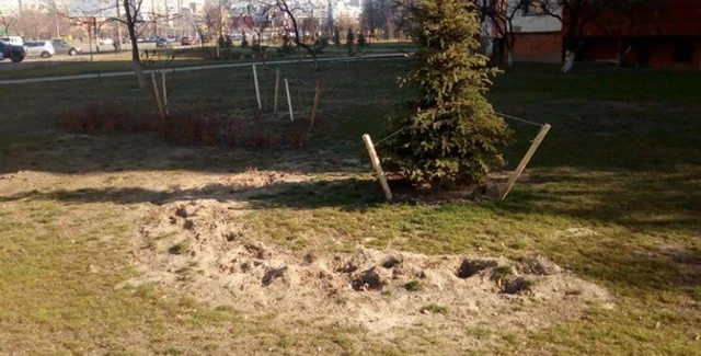 В украинской столице на Троещине неизвестные выкопали большинство зеленых насаждений в сквере на проспекте Маяковского, 2-Б, где установлен памятник Воину-добровольцу.