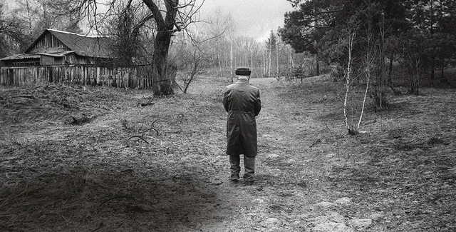 Александр стоит возле границы Зоны отчуждения, которая представляет собой забор из колючей проволоки. Мужчина долгое время работал в Чернобыльской зоне ликвидатором. Он вывозил на МАЗе, обшитом свинцом, радиоактивные отходы. Умер в 2013 году