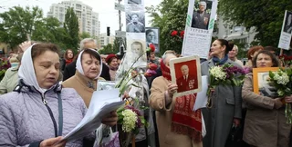 Люди двинулись от метро Арсенальная к Аллее Славы. В руках они несут портреты своих родственников, которые воевали во Второй Мировой войне, а также плакаты "Никто не забыт и ничто не забыто".