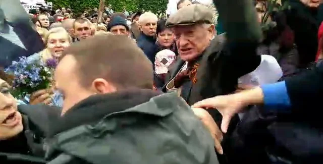 В Киеве перед Вечным огнем в Парке славы произошла потасовка между участниками шествия "Бессмертного полка" и националистом, который пытался обратить внимание полиции на георгиевскую ленту на пальто одного из участников акции. Об этом сообщает корреспондент Фокуса с места событий.