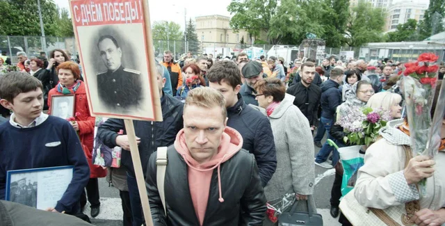 Формирование "Бессмертного полка" начинается с парного интервью. С одной стороны на камеру говорит бабушка с портретом, а с другой — женщина полубездомного вида во всесезонном наряде: куртке, платье, штанах и босоножках с носками.