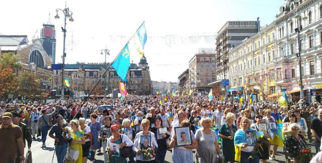 Присутствующие почтили память погибших украинских героев минутой молчания. Также не забыли и о тех украинцах, которые находятся в плену у России. Участники марша держали в руках фотографии украинских политзаключенных.