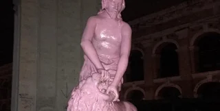 В Киеве на Контрактовой площади скульптуру Самсона покрасили в розовый цвет. Полиция задержала вандалов.