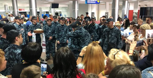 Украинских военных моряков из плена встречали традиционным украинским караваем с солью