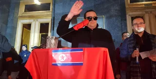 Под знаменами Северной Кореи перед трибуной выступил спикер похожий на лидера КНДР Ким Чен Ына. В конце своего выступления "Ким Чен Ын" раздал митингующим по жмене риса.