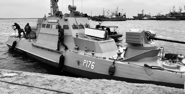 На "Бердянске" тоже отсутствует аналогичное оборудование. Кроме того, пробиты бронерубки и машинное отделение. Поврежден левый двигатель.