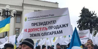 Несогласные с политикой властей держат плакаты с надписями: "Продажа земли – геноцид украинцев", "Фермеры против дерибана земли!".