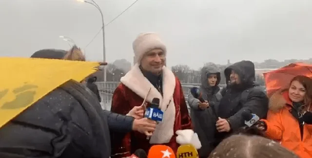 Первым по мосту проехал мэр Киева Виталий Кличко на квадроцикле и в костюме Деда Мороза