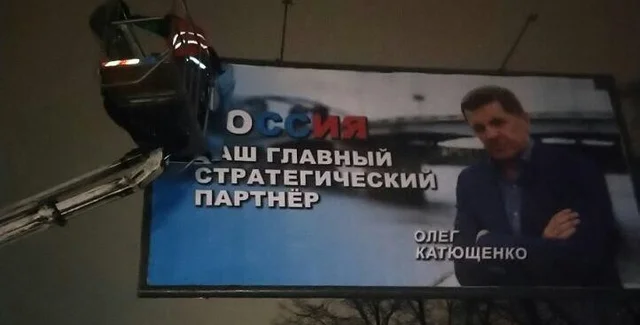 Коммунальщики убрали незаконную рекламу, которая содержала пророссийскую пропаганду с надписью "Россия – наш главный стратегческий партнер".
