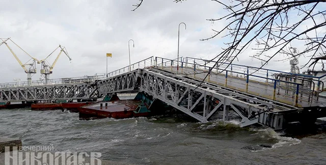 Как уточняет сайт 0512.com.ua, мост рухнул из-за шквального ветра. Металлическая конструкция отделилась от бетонной части со стороны Набережной и упала в воду.
