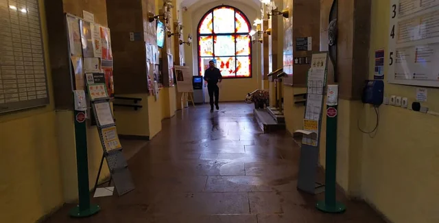 При входе в здание уже стоят две стойки с антисептиком и плакаты с полезной информацией